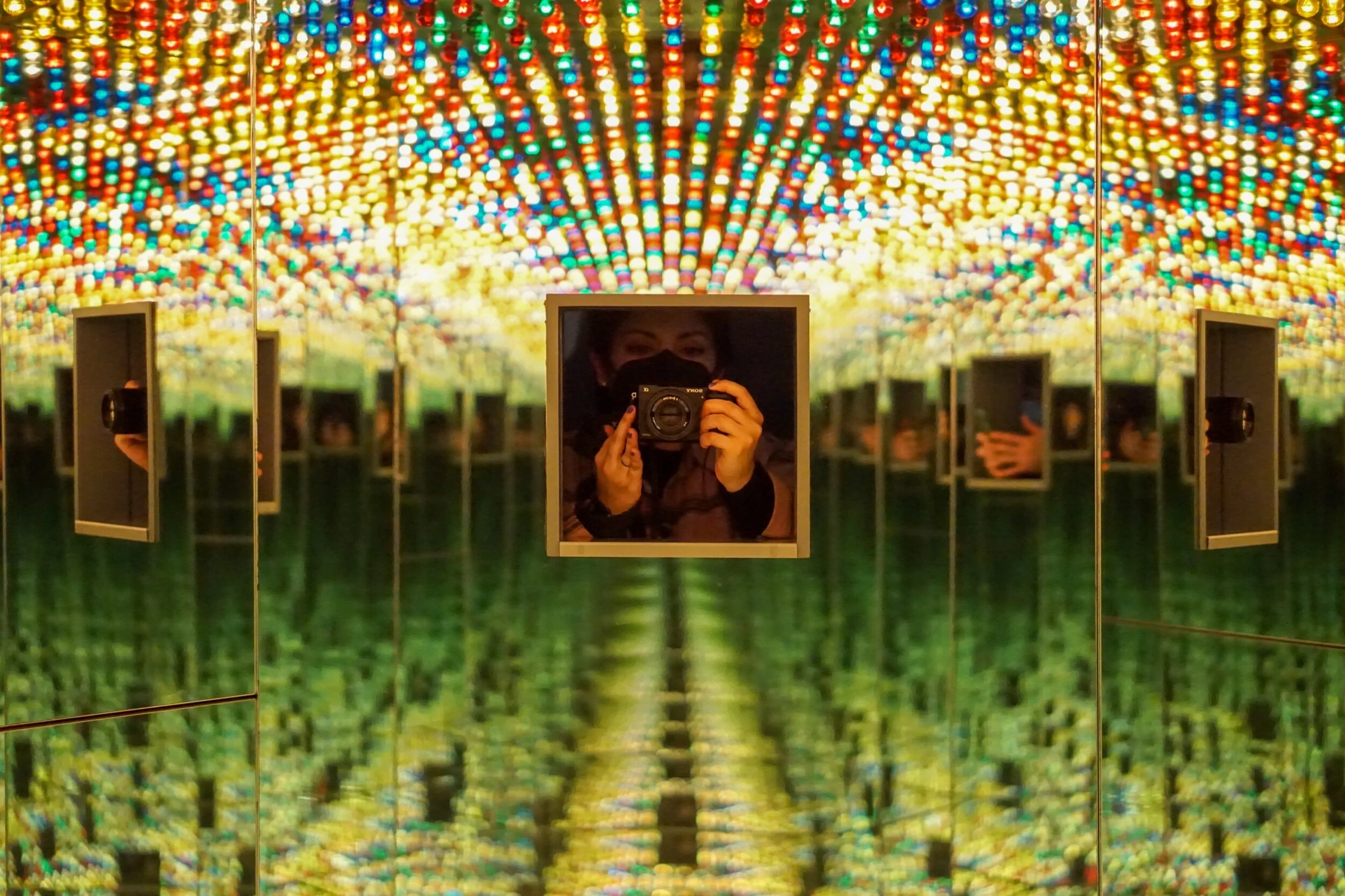 El siguiente punto clave en la obra de Kusama son los ‘espejos infinitos’, donde coloca obras dentro de cuartos rodeados de espejos. Esta repetición da vida a la ‘red infinita’ en un nivel más tangible. En la exposición se muestran 4 distintos cuartos infinitos, cada uno con su característica especial. El último, en particular, donde nos encontramos en un cuarto oscuro con burbujas iridiscientes flotantes que cambian de color, es una gran experiencia.